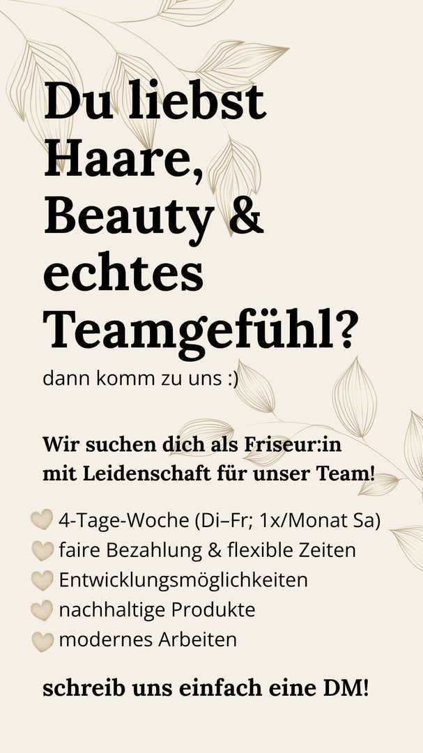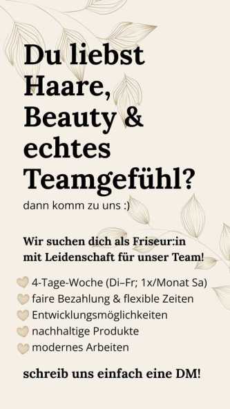 Wenn du außerdem Lust hast auf einen Salon, der Kreativität, Nachhaltigkeit und echte Wohlfühlmomente miteinander verbindet – für unsere Kund:innen und für uns im Team – dann bist du bei uns genau